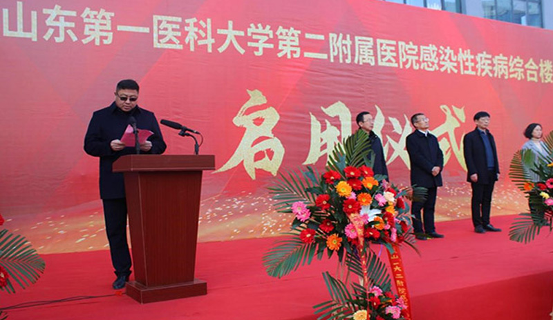 附屬醫院啟用儀式領導講話照片:山東第 一醫科大學第 二附屬醫院感染性疾病綜合樓占地面積約2100平方米,設計建筑面積7980平方米,地下一層,地上五層。項目大樓建設遵循“平戰結合、科學、功能完善”的原則,嚴格按照感染性疾病要求設計流程,集門診、檢查、住院于一體,日常服務于常見傳染病的診療和救治,遇到重大傳染病疫情時,可以迅速轉變成集中收治患者的高標準戰時救治基地。該項目為山東省醫療衛生系統17個主要項目之一,項目的啟動對提高醫院乃至泰安市和山東省的公共衛生服務與感染性疾病防控能力、保障人民群眾生命安全和身體健康具有重要意義。
